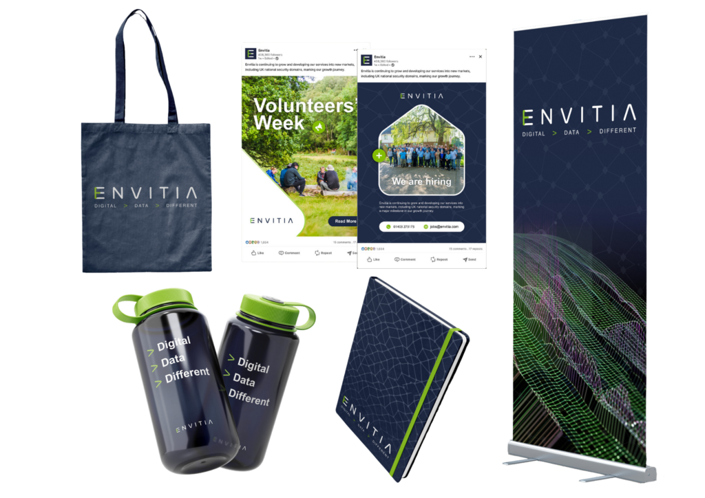 Envitia’s brand, however, isn’t limited to the digital space – it also needs to live and breathe in the physical world, extending beyond the logo to create a unified and adaptable brand experience. From staff materials and event assets to promotional items and social media, Envitia’s brand is designed to grow, evolve, and make an impact wherever it appears.